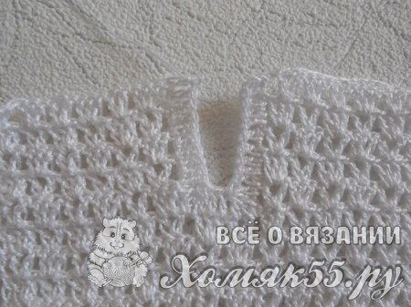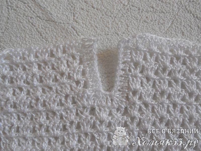 Аналогичным образом вяжите второй рукав. Кода оба рукава связаны, приступайте к обвязке горловины. Привяжите белую нитку к краю горловины и обвяжите ее столбиками без накида.