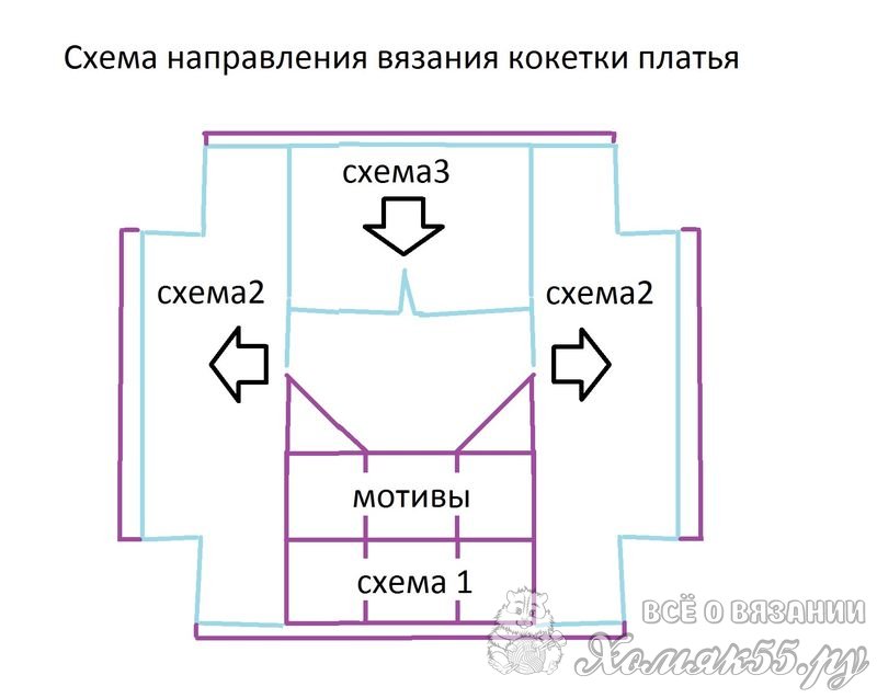 Для начала рассмотрим, как будет выполняться вязание кокетки платья. Схематично это можно изобразить так: