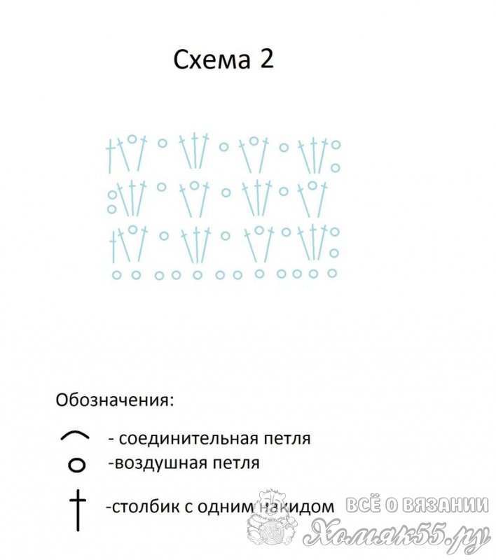 Для начала вязания центральной детали спинки, наберите цепочку из 45 воздушных петель. Дальше вяжите по схеме 2.