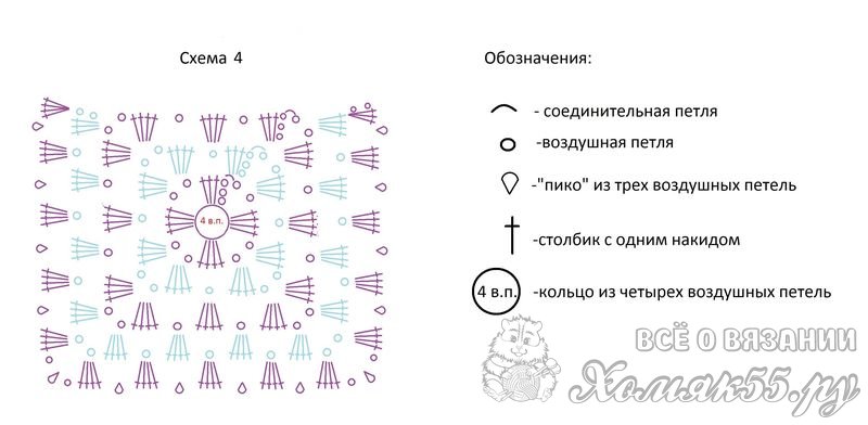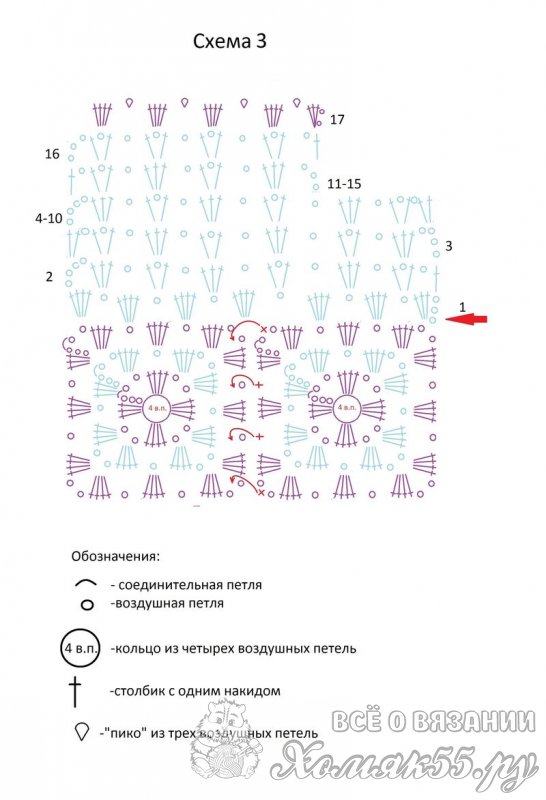 Для выполнения мотивов, нитками «Ирис» цвета фуксии наберите цепочку из четырех воздушных петель, замкните в кольцо, далее вяжите по схеме 1, где наглядно показано чередование цветов. Сиреневый цвет в схеме - это «фуксия», а голубой - это нитки «Ирис» белого цвета.