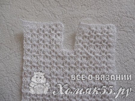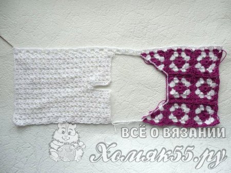 Провязав 10 рядов ровного полотна либо обрежьте нить и закрепите, а для вязания рукавов вновь завяжите рабочую нить отступив от края три «веера», либо провяжите рабочей нитью, до места где начинается рукав, полупетли в соответствующие петли основания.