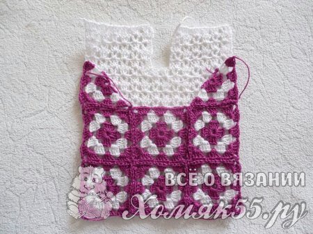 Для того чтобы соединить детали переда и спинки для начала привяжите белую нить к верхнему наружному углу центральной детали спинки и провяжите цепочку из 15 воздушных петель. Затем, продолжая вязать той же нитью, провяжите «косичку» по лицевой части детали переда. Когда провяжете косичку на детали переда, провяжите еще раз косичку из 15 воздушных петель и присоедините ее к противоположному углу детали спинки.