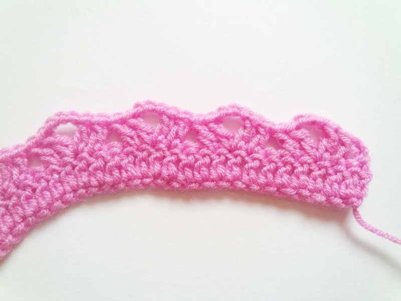 Дальше вяжем ст.с.н. В последний столбик мы не вяжем ничего. Пропускаем еще 1 столбик и повторяем. Ряд закончим ст.с.н.