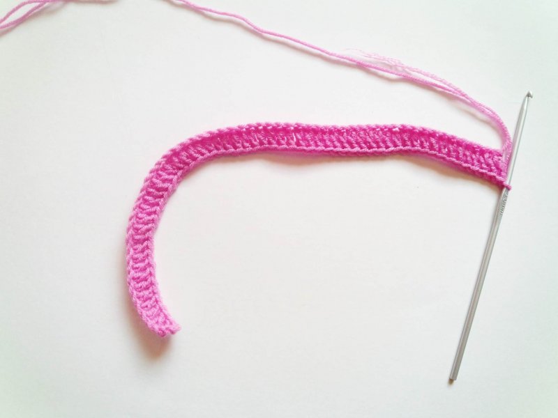 Вяжем следующий ряд. И его вяжем точно так же, как и предыдущий. Но теперь у нас будет больше ст.с.н за счет провязанного ранее ряда. В каждом последующем ряду мы будем в начале пропускать 1 столбик и в конце не довязывать также 1 столбик.