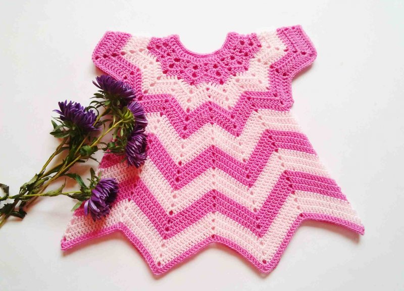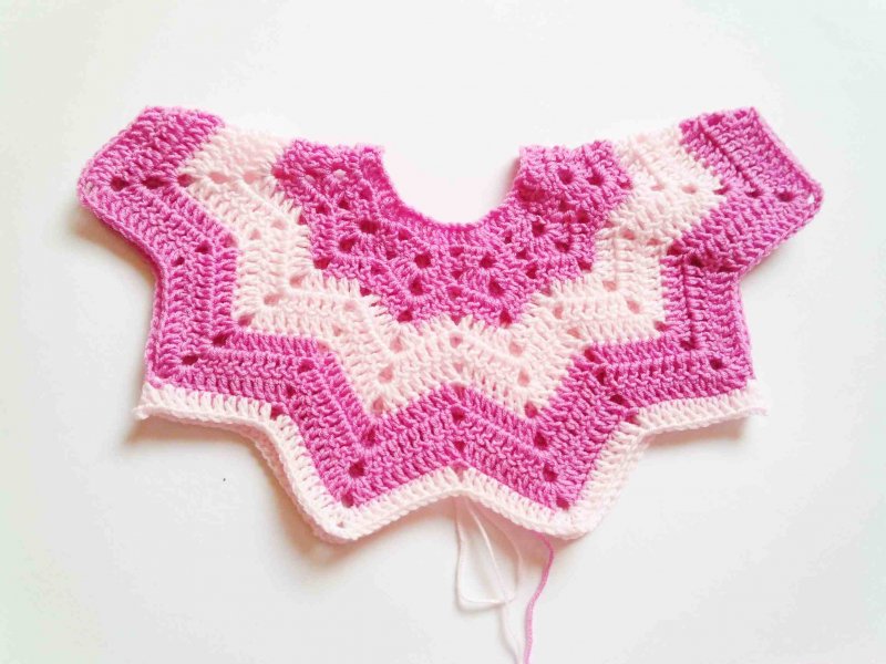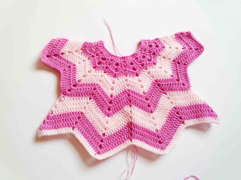 Так чередуем вязание до нужной длины платья, меняя цвета. Остальное вяжется аналогично предыдущим рядам.