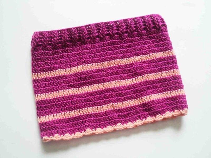 Далее переходим снова на простые ссн. Вяжем 5 рядов. Затем сменим нить и провяжем 1 ряд персиковым цветом. Далее 3 ряда основным цветом ссн. Снова ряд персиковым. Так вяжем до желаемой длины подола. Край оформим веерочками: вяжем 3 ссн в петлю, пропускаем 1 петельку и вяжем 1 сбн. Снова пропустим петлю основания и свяжем 3 ссн.