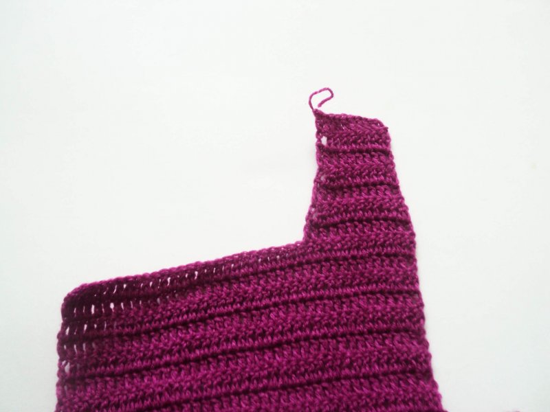 Переходим к вязанию лямок. Начинаем с 3 петель. Затем 12 ссн. Разворачиваемся и вяжем 2 ссн с общей вершиной. Далее вяжем до конца, но последние 2 ссн провязываем тоже вместе. То есть убавили в начале и в конце ряда.