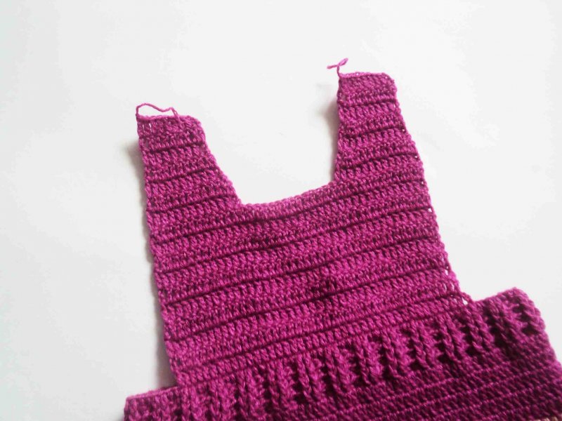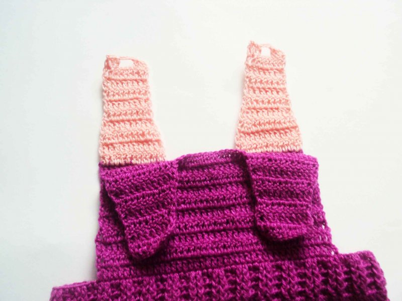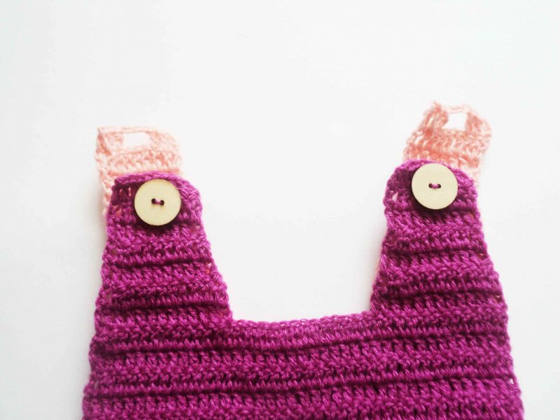 Лямки свяжем персиковой нитью по такой же схеме, как и передние. Только в конце свяжем не 3 ряда без убавок, а 5. Чтобы сформировать дырочку для пуговки, провяжем еще 1 ряд. Свяжем 3 петли, затем 2 ссн. Далее 4 вп, пропускаем 3 петли и довязываем ряд 3-мя ссн.