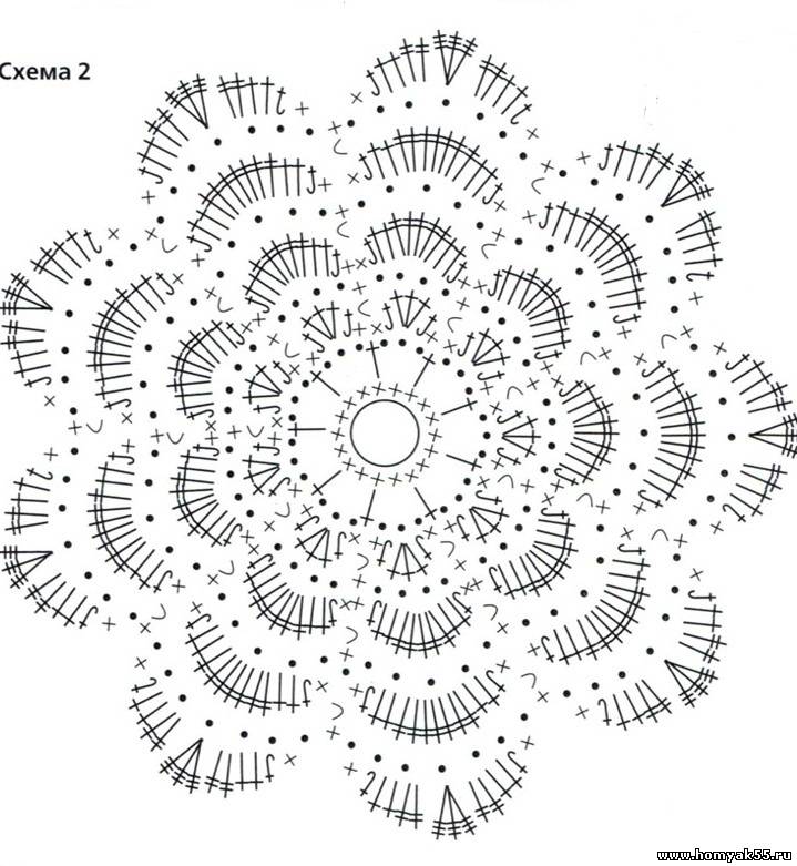 Готовое изделие отпарьте, выполните боковые швы, шов на одном плече. На втором плече с одной стороны пришейте пуговицы, с другой выполните навесные петли (цепочки из возд. петель). Обвяжите вырез горловины СБН, проймы следующим образом: * СБН, 2 ССН, 1 С2Н, 2 ССН, СБН *, повторяйте *-*. Свяжите 7-8 розочек по схеме 2 (каждая розочка состоит из 4 ярусов). Пришейте цветы по низу платья, как показано на фото.