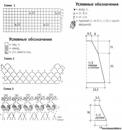 Наберите цепочку из 36 ВП и вяжите ажурную сетку белого цвета 16 рядов по схеме 2, повторяя со 2-го по 5-й ряды. Свяжите 4 рюши по схеме 3 (белую, цвета джинс и две - розовые), привязывая 1-ю рюшу к краю рукава, остальные - равномерно распределив по длине рукава.Сборка
