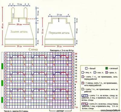 Нитью белого цвета набрать 42 петли, связать 4 ряда платочной вязкой и продолжить лицевой гладью, выполняя первые и последние 3 петли платочной вязкой. На высоте 6 см прибавить с обеих сторон для пройм по 9 петель = 60 петель.$CUT$ Набранные для пройм петли вместе с крайними 3 петлями вязать платочной вязкой на протяжении еще 4 рядов и затем все петли вязать лиц. гладью, прибавляя с обеих сторон в каждом 6-м ряду 9 раз по 1 петле = 78 петель.На высоте 25 см связать 4 ряда платочной вязкой, равномерно прибавив в 1-м ряду 4 петли = 82 петли, и продолжить узором по схеме. Через 20 рядов связать нитью белого цвета еще 4 ряда платочной вязкой и закрыть петли. Общая высота около 33 см.