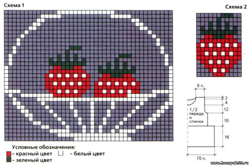 Вышейте на груди корзину с клубничками по схеме 1 (1 клеточка = 1 петля), по спинке и юбочке сарафана вышейте отдельные ягоды клубнички по схеме 2 в произвольном порядке. Выполните швы сарафана Обвяжите крючком белой нитью нижний край, горловину и проймы сарафана одним рядом СБН и 1 рядом «пико». Пришейте на плечики пуговицы, выполните навесные петли.