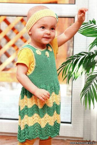 Вам потребуется: пряжа 50% вискоза, 50% акрил, 100 г - 440 м, зеленого и желтого цветов - по 100 г; спицы № 2,5; крючок № 2.