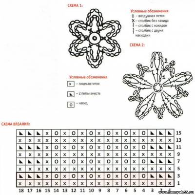 2-й ряд: 1 петля подъема, 1 СБН, 1 ПСН, 1 ССН, 1 С2Н, 1 ССН, 1 ПСН, 1 СБН.