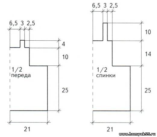 Вяжите аналогично спинке, но на высоте кокетки 10 см. закройте средние 26 петель и далее каждую сторону вяжите отдельно еще 4 см прямо. Петли закройте.