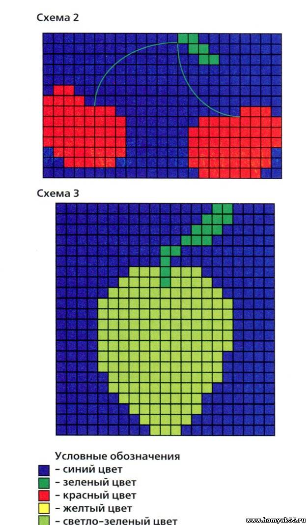 Вышейте на передней половинке фрукты и ягоды по схемам швом «петля в петлю». Сшейте детали, обвяжите края бордовой нитью крючком СБН. Пришейте пряжки.