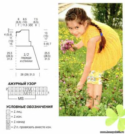 Очень красивый ажурный сарафан для девочек вяжется спицами из жёлтой пряжи.