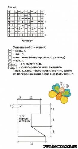 На спицы №3 наберите 176 петель и вяжите лиц. гладью. На высоте 1 см от наборного края провяжите для подгиба 1 изн. ряд лиц. петлями и далее снова вяжите лиц. гладью.$CUT$ На высоте 12 см от наборного края равномерно убавьте количество петель до 79, далее вяжите ажурным узором. На высоте 15 см от начала ажурного узора наберите с обеих сторон для рукавов по 34 петли = 147 петель, прибавленные петли включите в ажурный узор. На высоте 5 см. от начала рукавов закройте для разреза на спинке среднюю петлю и обе стороны закончите отдельно. На высоте разреза 6 см все петли закройте, при этом 54 внешние петли приходятся на рукав и плечо, 19 внутренних петель - на вырез горловины. Другую сторону вяжите аналогично.Перед и 1/2 рукавов