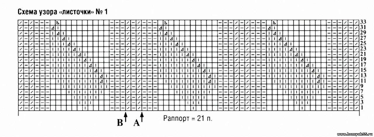 Вязать снизу вверх. На спицы № 3 набрать 146 петель и вязать 133 ряда следующим образом: 1 кром. петля, * 12 петель лиц. гладью, 21 петля узором «листья» согласно схеме 1 *, повторить от * до * 3 раза, 12 петель лиц. гладью, 1 кром. петля.