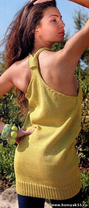 Размер: 40 (42; 44). Вам потребуется: 300 (300; 300) г пряжи SNAPPY BALL (100% хлопок; 200 г/540 м) Ms 98 желто-зеленого цвета, спицы № 3,5 и 4, гобеленовая игла.
