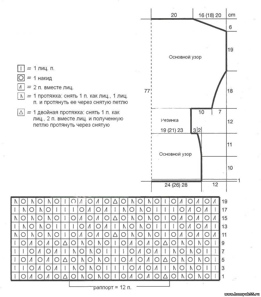 Основной узор: число петель кратно 12 + 1 петля. Вязать согласно схеме. В изн. рядах все петли и накиды вязать изн. Повторять с 1-го по 20-й ряды. $CUT$