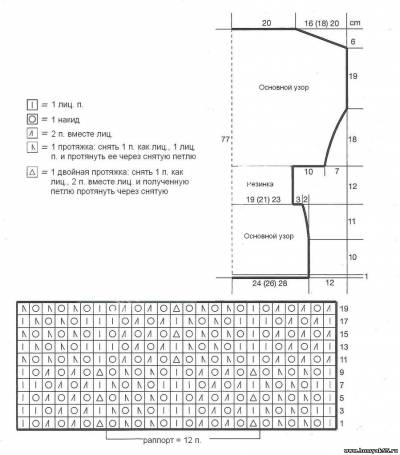 Набрать 89 (97) 105 петель и для роликового края связать 1 см лиц. гладью. Продолжить основным узором след. образом: кром. петля, 1 (5) 3 лиц. петля, начать с 6 петель перед раппортом, 6 (6) 7 х раппорт, закончить 7 петлями после раппорта, 1 (5) 3 лиц. петля, кром. петля. Через 10 см от роликового края для бедренных скосов убавить 1 петлю и в каждом след. 6-м ряду еще с обеих сторон убавить 3 х 1 петле = 81 (89) 97 петля. Через 21 см от роликового края продолжить на спицах № 3,5 резинкой, при этом в 1-м ряду равномерно убавить 11 петель = 70 (78) 86 петель.На высоте резинки 12 см продолжить основным узором, при этом в 1-м ряду равномерно прибавить 41 петлю = 111 (119) 127 петель и вязать след. образом: кром. петля, 0 (4) 2 лиц. петель, начать с 6 петель перед раппортом, 8 (8) 9 х раппорт, закончить 7 петлями после раппорта, 0 (4) 2 лиц. петель, кром. петля.