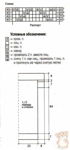 Наберите 159 петель + 2 кром. петли, вяжите 7 см резинкой 2 x 1. Далее вяжите ажурным узором. На высоте 64 см от резинки отложите все петли.Спинка