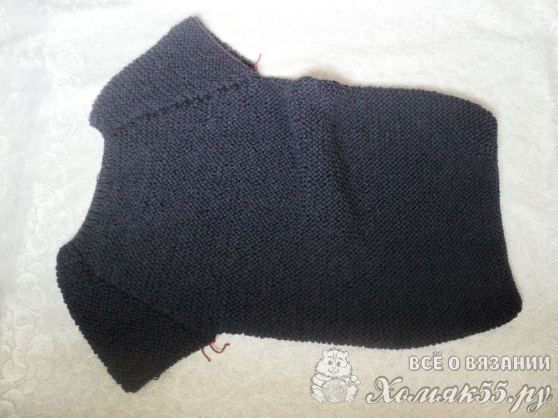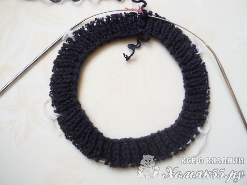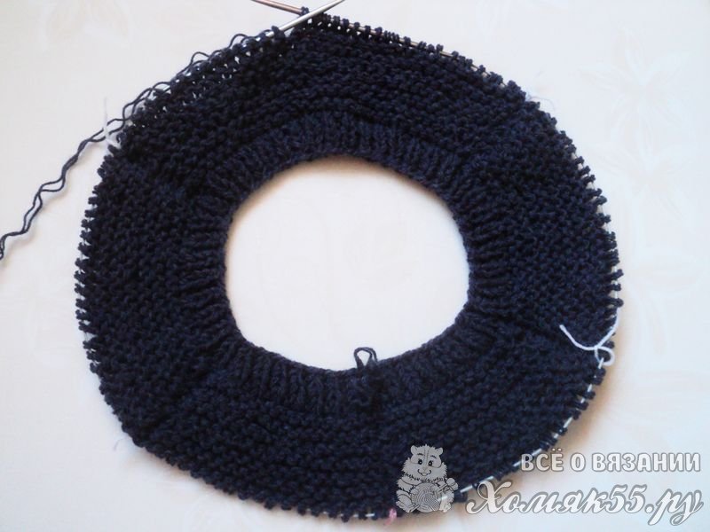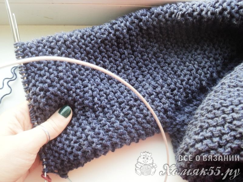 Провязав 3-4 см резинкой, перейдем на платочную вязку. Здесь необходимо рассчитать петли и поделить их. Также нужно, чтобы начало ряда находилось сзади посерединке, то есть на спинке, так как там будет шов – переход от лицевого ряда к изнаночному.