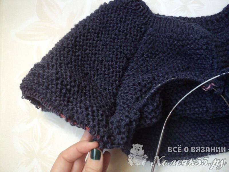Возвращаемся к рукавам. И переносим петли на спицы. Присоединяем нитку и вяжем точно так же, как вязали подол платья, то есть просто чередуя ряды.