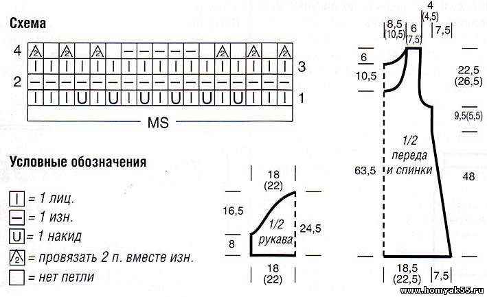 Ажурный узор, спицы №6: число петель кратно 11 + 2 кром. Вязать по схеме, на которой приведены лиц. и изн. ряды. Повторять между кром. раппорт. Повторять с 1-го по 4-й ряды. При убавлениях следите за тем, чтобы число накидов соответствовало числу провязанных вместе петель.