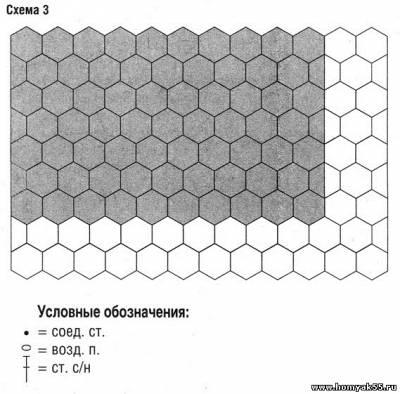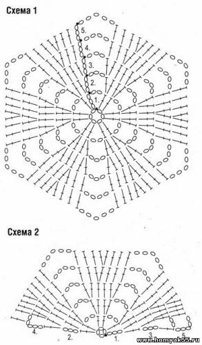 Для половинчатого мотива наберите цепочку из 4ВП , замкните в кольцо СС. 1-й ряд - ВП, 2 ССН, 2 ВП, 2 ССН. Далее вяжите прямыми и обратными рядами по схеме 2 со 2-го по 5-й ряды. Нить обрежьте и закрепите. Свяжите 8 таких мотивов нитью Isoveli или 6 мотивов нитью Hanko.