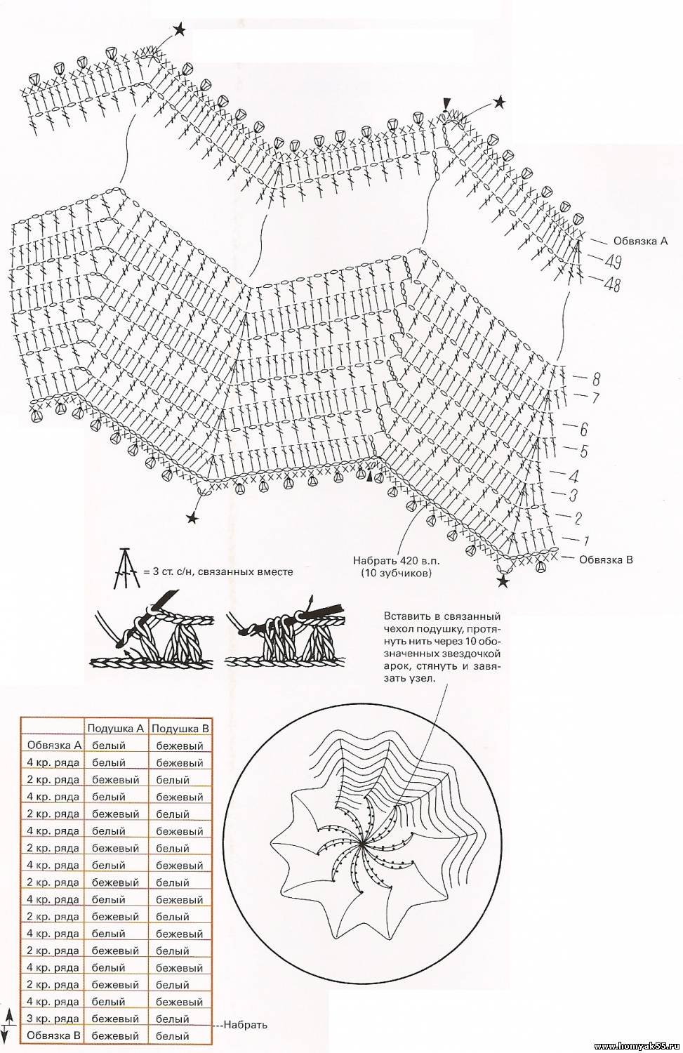 Подушку А начинать пряжей бежевого цвета, подушку В - пряжей белого цвета. Цепочку из 420 ВП замкнуть в круг.1-й круг. ряд: *19 ССН (в каждую петлю), 3 ССН, связанных вместе (1-й в следующую петлю, 2-й и 3-й через 1 петлю), 19 ССН (в каждую петлю), 3 ВП, от* повторять. При этом до 48-го ряда вместо 2 последних ВП провязывать 1 ПСН в последнюю из 3 ВП, которые в нечётных рядах вывязаны вместо 1-го ССН, и в последнюю из 4 ВП, которые в чётных рядах вывязаны вместо 1-го С2Н. $CUT$