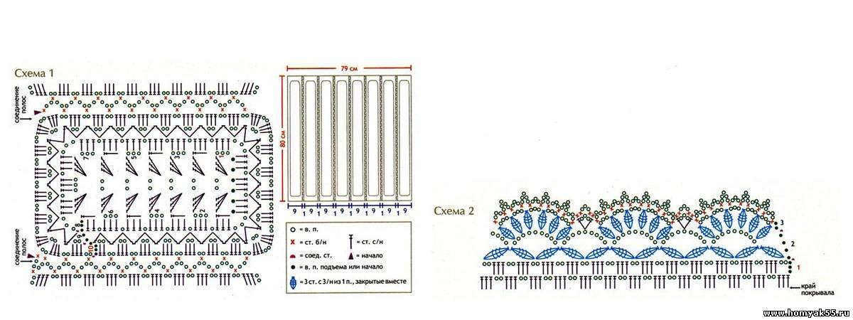 Связать 8 полос по схеме 1. Для этого нитью белого цвета набрать цепочку из 7 ВП и вязать центральную полосу, повторяя 7 ряд до 74 см в длину. Затем обвязывать центральную полосу по кругу с 8 по 10 ряды, выполняя 1 ряд нитью голубого цвета, 1 ряд - белого цвета, 1 ряд - аквамаринового цвета. Соединить полосы по схеме 1. Общая высота около 80 см.