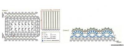 Обвязать края всего изделия нитью аквамаринового цвета кружевом по схеме 2. Изделие увлажнить и дать ему высохнуть.