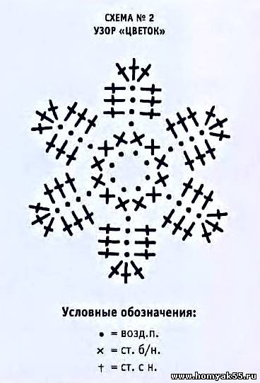 Вязать но описанию и по схемам № 1 и № 2.1-й ряд: связать цепочку из 8 ВП и соединить в кольцо (цвет пряжи - белый).