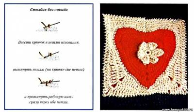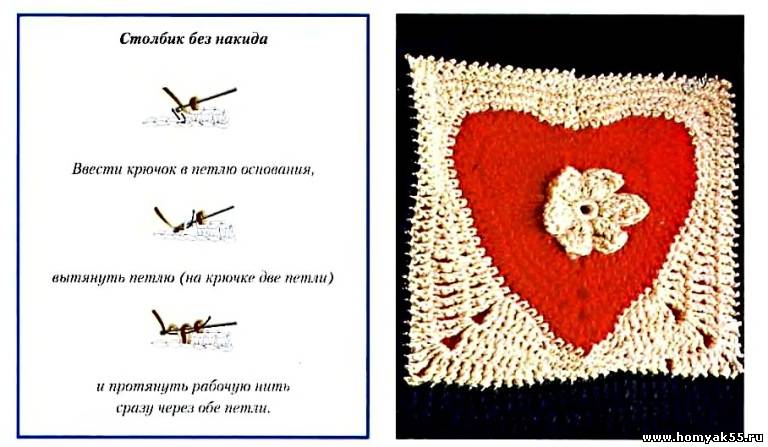Связать нужное количество прямоугольников. Соединить прямоугольники СБН.$CUT$ Обвязать готовое изделие отделкой по вашему выбору: ССН или СБН (цвет пряжи - красный, 3 ряда).Цветок в середине квадратного мотива вяжется как единое целое. Сначала "цветок" вывязывается целиком, затем необходимо вернуться к начальному ряду и вязать СБН по кругу и по описанию. Цветок остается сверху, а квадратный мотив с узором «сердечко» начинается под ним и постепенно приобретает форму квадрата.