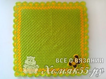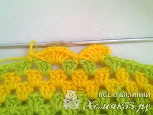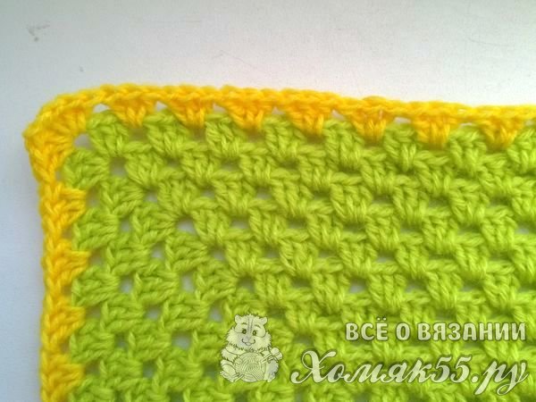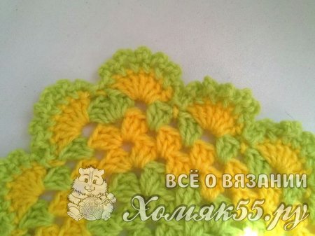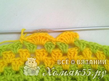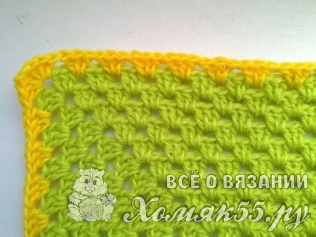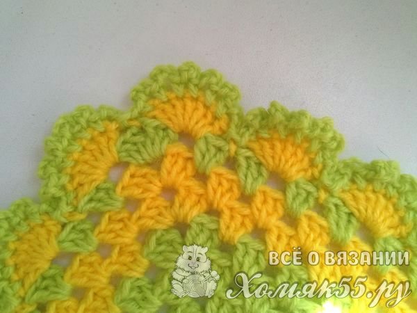 Свяжем два ряда желтым цветом. И еще один ряд зеленым. А далее сделаем обвязку краев. В одну арку мы будем вязать по семь ССН, в другую один СБН. И так чередуем обвязку по всему пледу.