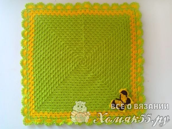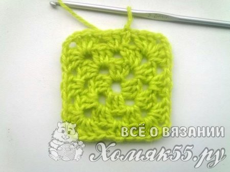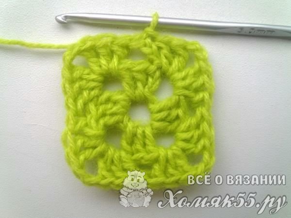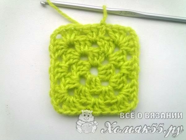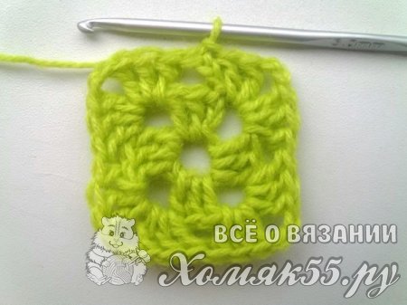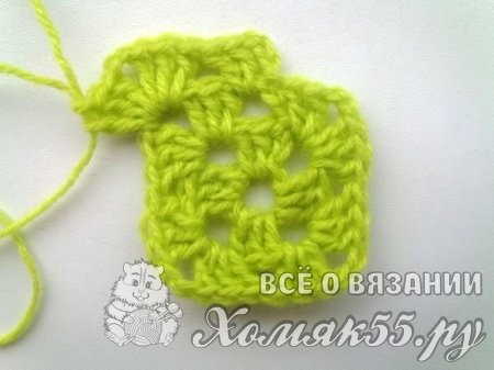 Мы в уголки будем вязать всегда одно и то же. И в арки, которые находятся у нас по сторонам квадрата, всегда вяжем просто по три ССН. Так у нас получается знаменитый бабушкин квадрат. Вяжем несколько рядочков для нужного размера пледика. И, завершая бабушкин квадрат, мы поменяем цвет нитки на желтый.