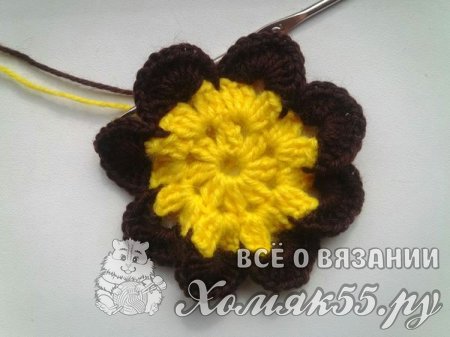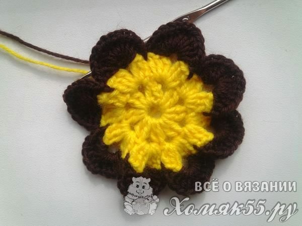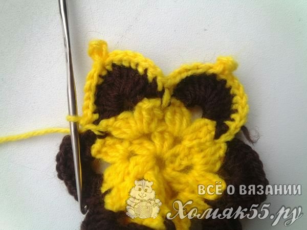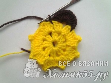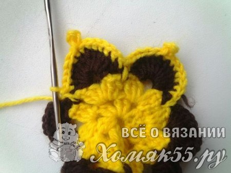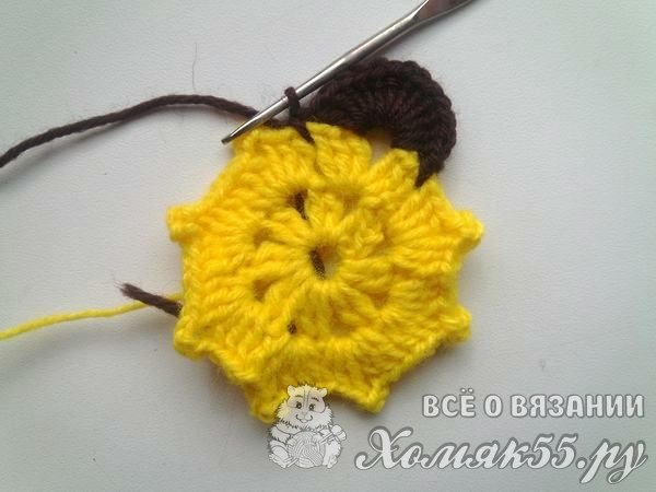 Теперь прикрепим коричневую пряжу. Под цепочку из ВП мы вяжем шесть ССН. Делаем одну ВП и сюда же мы выполняем еще шесть ССН. Пропускаем нижние три ССН и вяжем СБН.