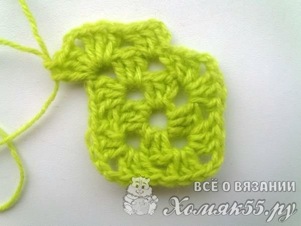 Вяжем новый ряд квадрата. И делаем из арочки, в которой у нас находится крючок, три ВП. В нее же вяжем два ССН.