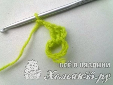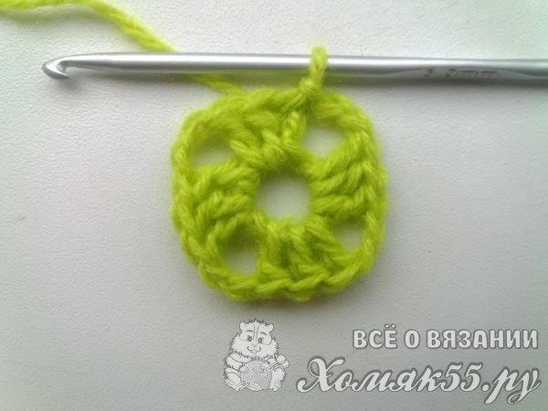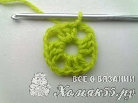 Основной цвет пледа будет ярко-зеленый. Поэтому начинаем вязать нитками этого цвета. Делаем шесть петелек, которые замыкаем в кольцо.