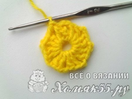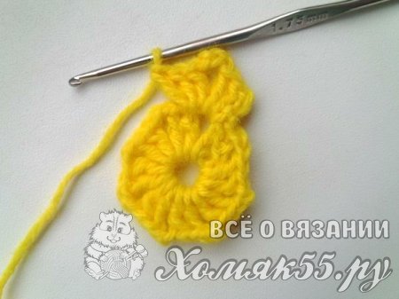 Теперь вяжем для украшения пледа бабочку. Вяжем пять ВП и замыкаем в кольцо. Далее вяжем три ВП и еще один ССН. Делаем две ВП. И еще два ССН. Всего нам нужно так провязать восемь раз. То есть у нас получится шестнадцать ССН.