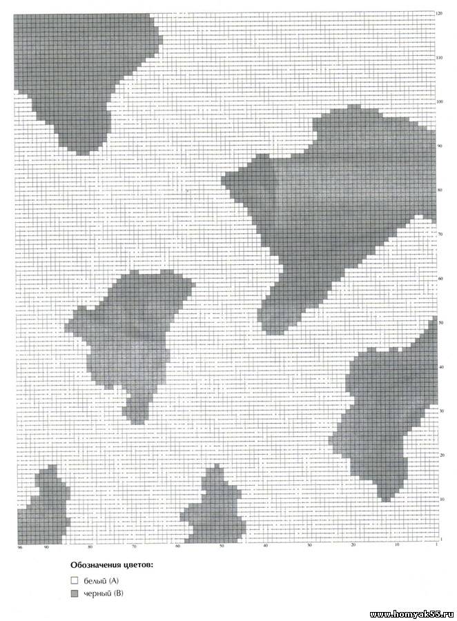 Пряжей цвета А свяжите цепочку из 97 ВП. Начальный ряд (изн.): 1 СБН во 2-ю ВП от крючка, 1 СБН в каждую петлю до конца ряда – 96 петель, 1 ВП, поверните. Вяжите по схеме. 1-й ряд (лиц.): вяжите СБН (и 1 ВП для поворота), начав ряд с 1-й петли и закончив 96-й. Продолжайте вязать, пока не закончите 120-й ряд. Свяжите пряжей цвета А 1 в.п., поверните. Провяжите еще один ряд. Оборвите нить.