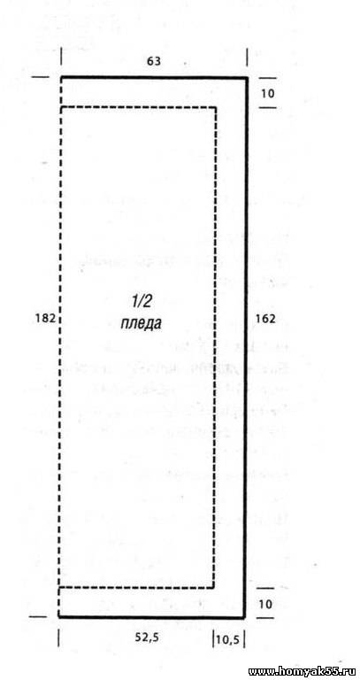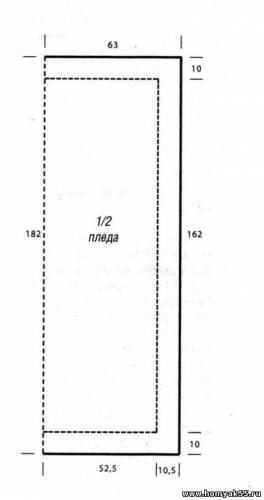 Через 162 см = 244 ряда от планки вязать на всех петлях платочной вязкой, при этом в 1-м ряду провязывать в каждом раппорте 2 х 2 петли вместе лиц. = 118 петель. Через 10 см = 19 рядов от начала вязания планки все петли закрыть изн.