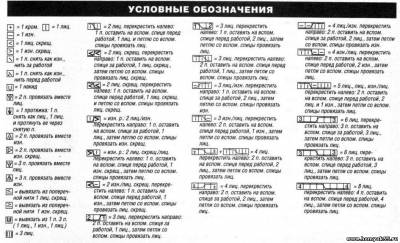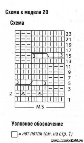 Узор из кос: число петель сначала кратно 7. Вязать по схеме. Приведены лиц. ряды и 1-й изн. ряд. В неприведенных изн. рядах петли вязать по рисунку. Повторять петли раппорта. Выполнить 1 раз 1-й и 2-й ряды, повторять с 3-го по 22-й ряды, заканчивать 23-м и 24-м рядами. После 2-го ряда число петель кратно 9.