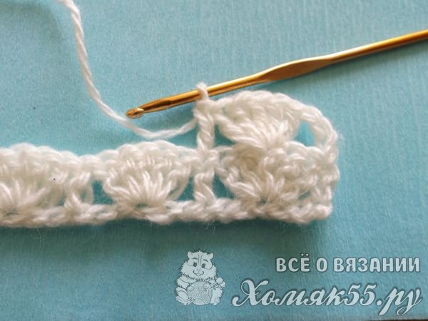 Далее пропускаем еще две петли и в третью вяжем «ракушку». Продолжаем так повторять узор до конца ряда. На выходе у нас должно получиться 9 таких «ракушек» и 10 ССН.