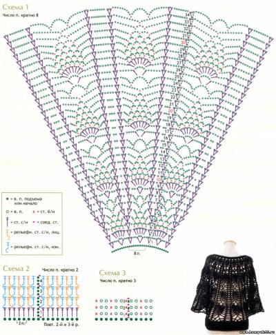 Нитью контрастного цвета наметить по 4 мотива для спинки и переда и по 4 мотива для каждого рукава, как указано на схеме пончо. Обвязать нижний край спинки и переда резинкой по схеме 2. Через 8 см закончить вязание. Вырез горловины обвязать 3 рядами отделки по схеме 3. Изделие увлажнить и дать ему высохнуть.