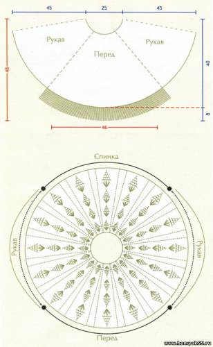 Вязать одной деталью, начиная с выреза горловины. Набрать цепочку из 128 ВП и замкнуть в кольцо СС. Продолжить узором по схеме 1 = 16 раппортов. Выполнив 34-й ряд, закончить вязание.