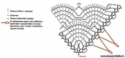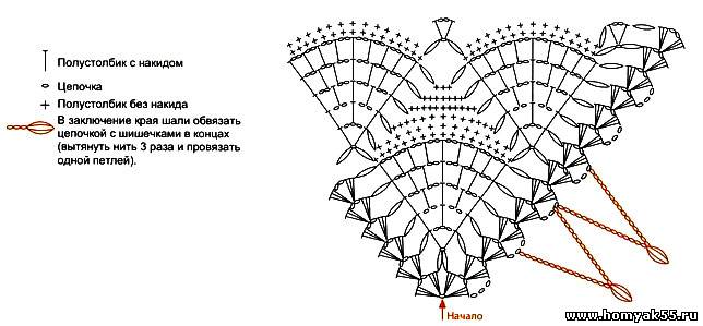 Начинайте вязать от угла по схеме до необходимой вам длины. В заключении края шали обвязать цепочкой с шишечками на концах (вытянуть нить 3 раза и провязать одной петлёй).