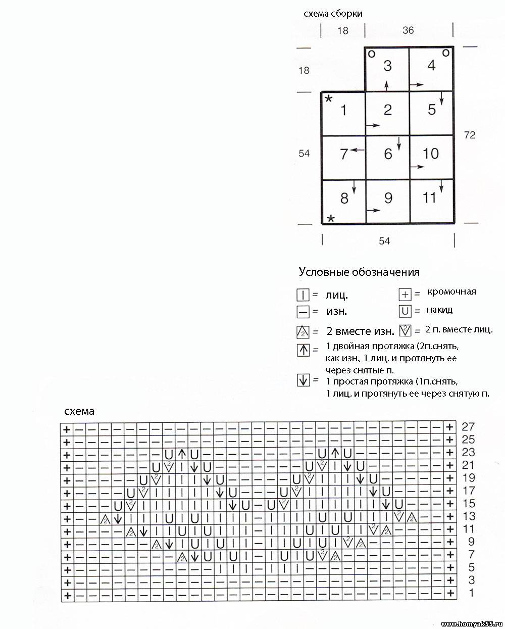 Узоры Ажурный квадрат на 31 петлю: вязать по схеме. В изн. рядах вязать по рисунку, накиды – изн. вязать с 1-го по 24-й ряды, затем с 5-го по 28-й ряды = 48 рядов.